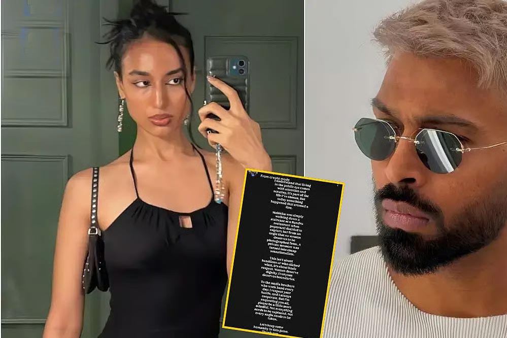 हार्दिक पांड्या ने अपनी इंस्टाग्राम स्टोरी पर लिखा- 'मैं समझता हूं कि लोगों की नजरों में रहने से ध्यान और जांच-पड़ताल की जरूरत पड़ती है, ये मेरी चुनी गई जिंदगी का हिस्सा है. लेकिन आज कुछ ऐसा हुआ जिसने हद पार कर दी. माहिका बांद्रा के एक रेस्टोरेंट में सीढ़ियों से उतर रही थीं, तभी मीडिया ने उन्हें ऐसे एंगल से कैद किया, जिस एंगल से कोई भी महिला तस्वीर लेना डिजर्व नहीं करती. एक प्राइवेट मूमेंट को घटिया सनसनी में बदल दिया गया.'