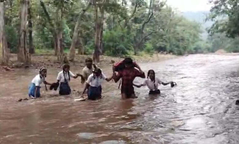 तेज बारिश के कारण नदी का जलस्तर बढ़ने से बच्चे घंटों तक नदी किनारे फंसे रहे. बारिश में भीगते हुए खड़े मासूम बच्चों को देखकर गांव के कुछ ग्रामीणों ने अपनी जान की परवाह न करते हुए बारी-बारी से उन्हें नदी पार कराया.